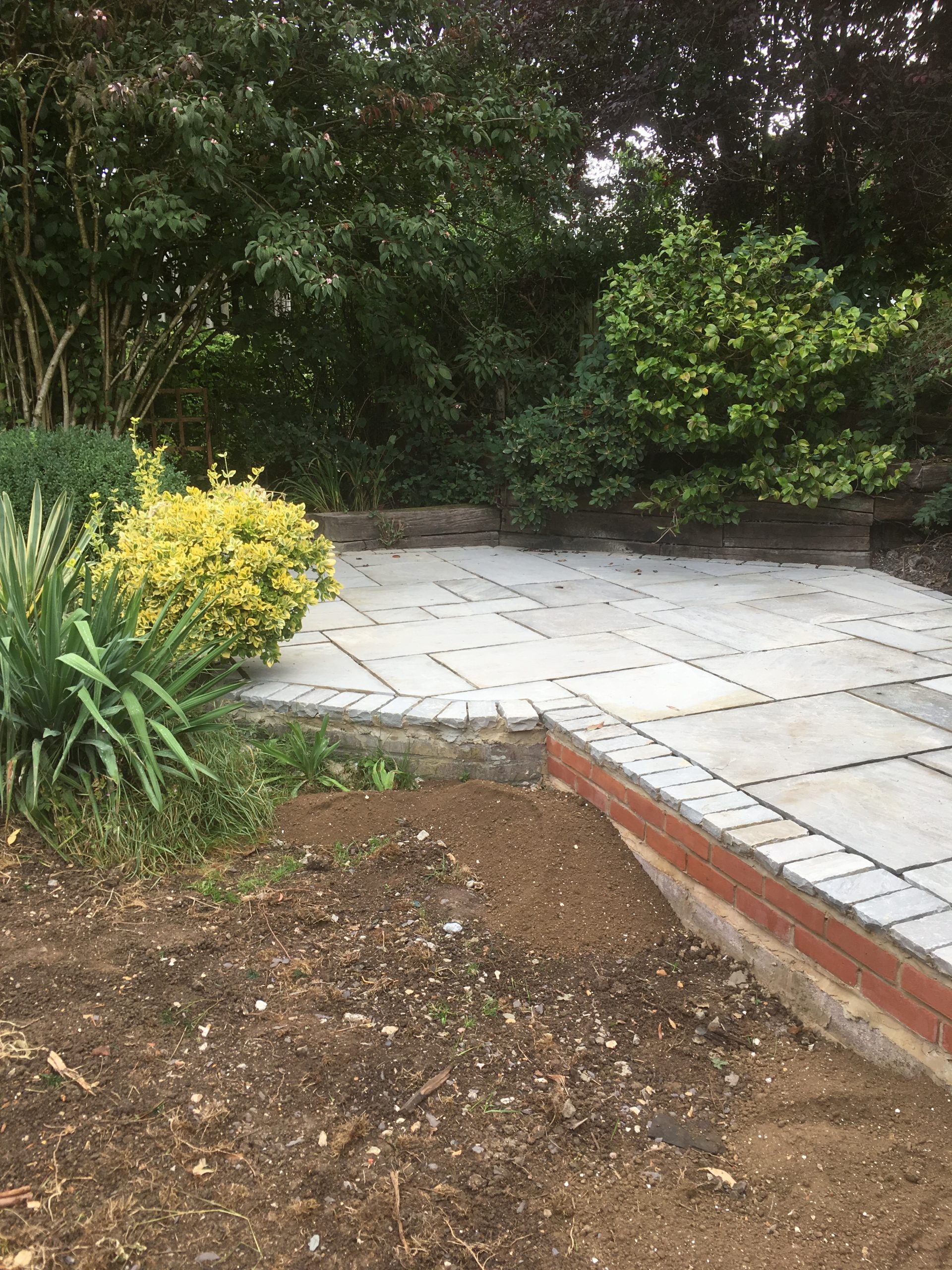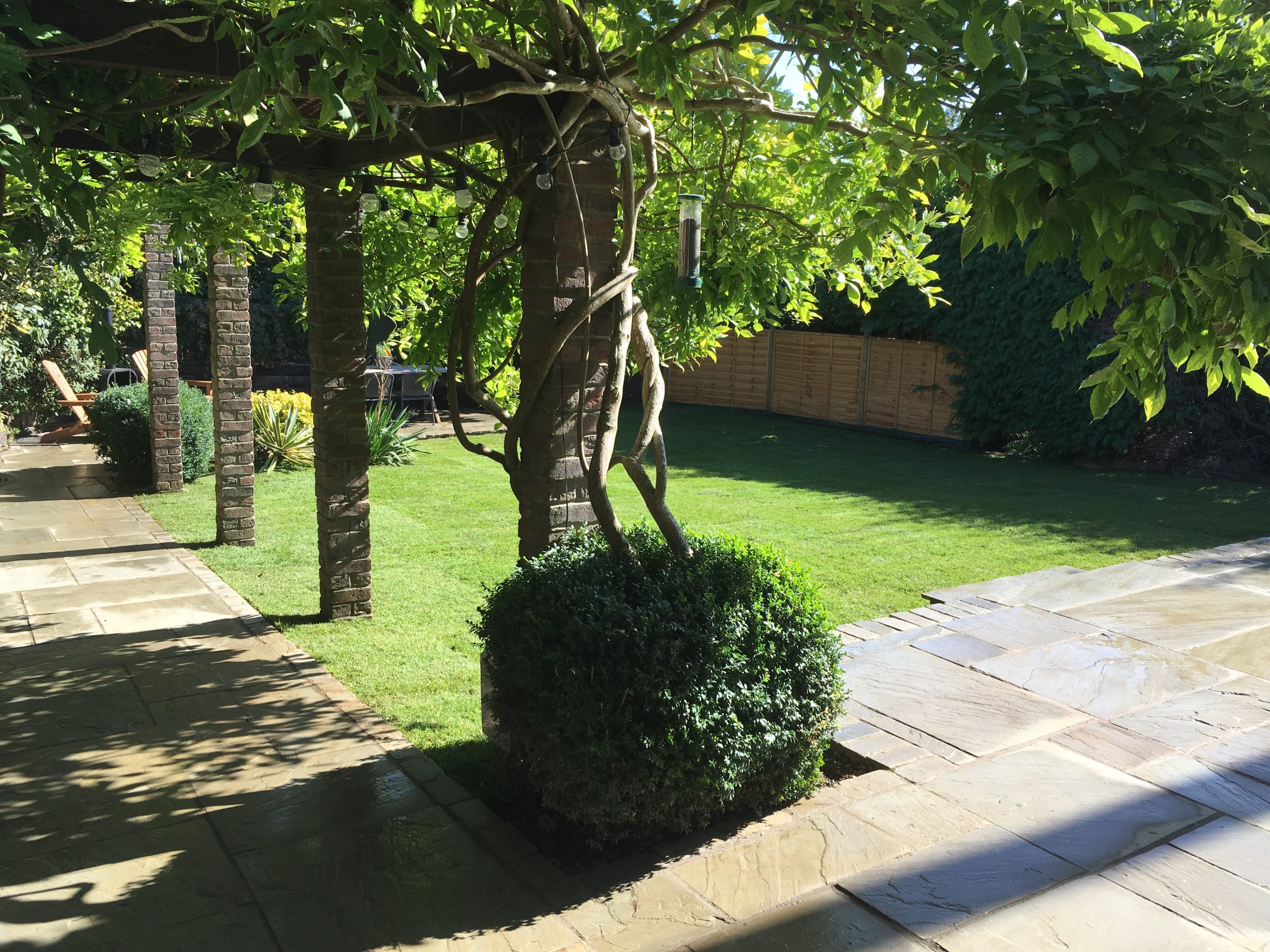 A complete garden design and landscaping of a rear garden. The client required a new wrap-around patio at the rear of the house, with a side access path, a smaller patio area at the bottom of the garden joined by another pathway under a loggia – around 130 sq metres in total. The patio was specified as Indian Sandstone with granite setts around all edges.